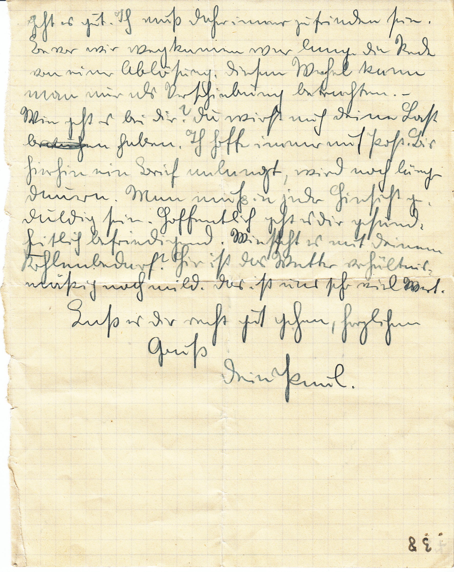 Wie geht es bei Dir? Du wirst auch Deine Last brauchen haben. Ich hoffe immer auf Post. Bis hierhin ein Brief anlangt, wird noch länger dauern. Man muß in jeder Hinsicht geduldig sein. Hoffentlich geht es Dir gesundheitlich befriedigend. Wie steht es mit Deinem Kohlenbedarf? Hier ist das Wetter verhältnismäßig noch mild. Das ist uns sehr viel wert.