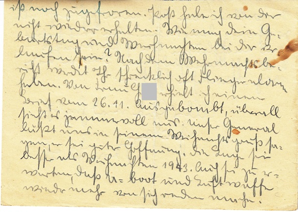 Von Frau H. erhielt ich einen Brief vom 26.11. Ausgebombt, überall sieht es jammervoll aus. Unser General läßt uns in seinem Weihnachtsgruß sagen, er sei guter Hoffnung. Die Lage sei besser als Weihnachten 1943. Auch sei zu erwarten, daß U-Boot und Luftwaffe wieder mehr von sich reden machen.