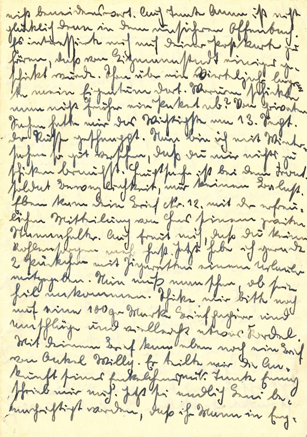Eben kam Dein Brief Nr. 12 mit der erfreulichen Mitteilung von Hans seinem zweiten Stammhalter. Auch freut mich, daß Du keine Kohlensorgen mehr hast. Jetzt habe ich gerade 2 Päckchen mit Zigaretten einem Urlauber mitgegeben. Nun muß man sehen, ob sie Heil ankommen. Schicke mir bitte noch auf eine 100 Gr. Marke Briefpapier und Umschläge und vielleicht etwas Kordel. Mit Deinem Brief kam eben noch ein Brief von Onkel Willy. Er teilt mir die Ankunft seines Enkelchens mit. Tante Emmy schrieb mir auch. Jetzt sei endlich Leni benachrichtigt worden, daß ihr Mann in Eng-