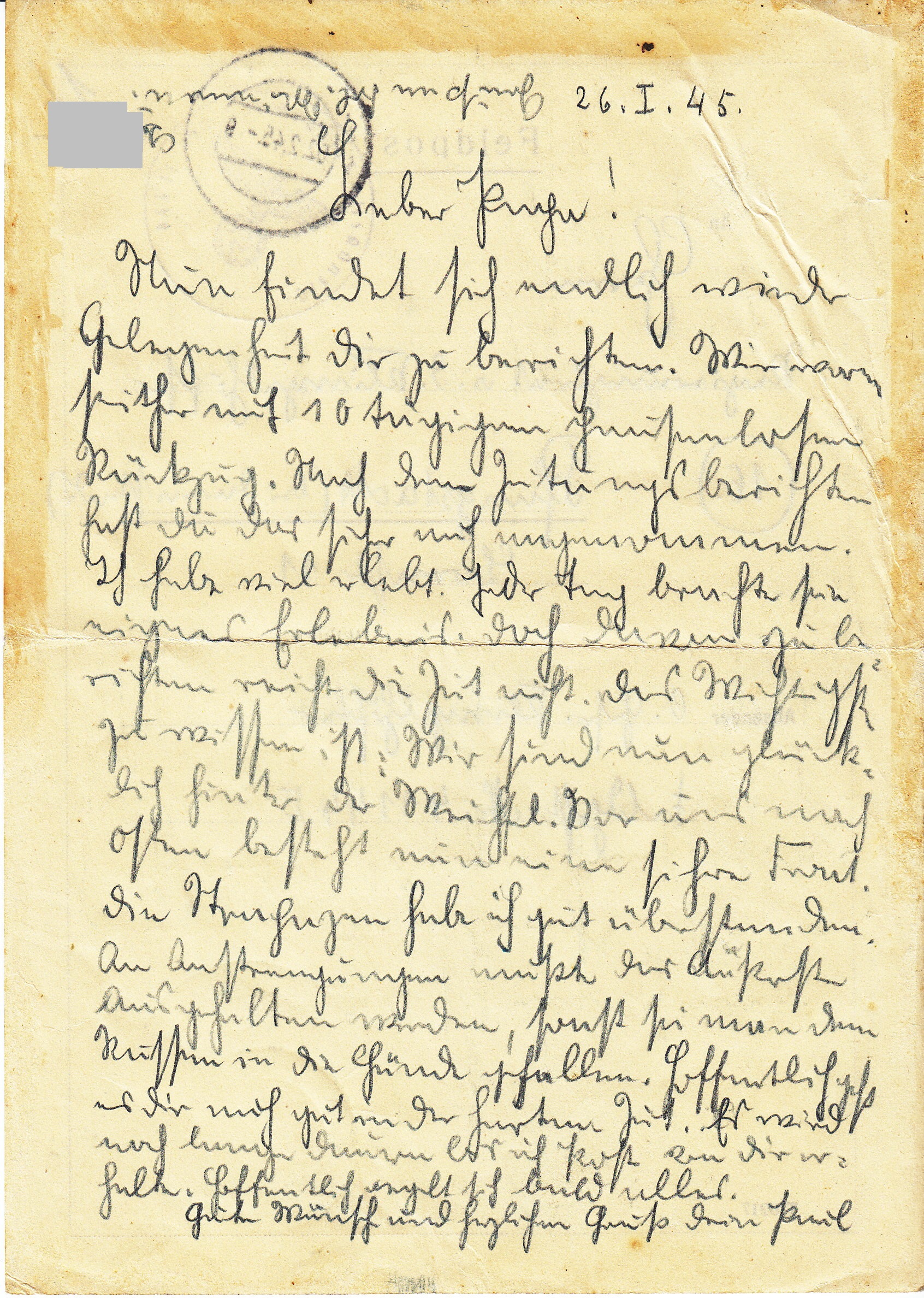 Nun findet sich endlich wieder Gelegenheit Dir zu berichten. Wir waren seither mit 10tägigem pausenlosem Rückzug. Nach den Zeitungsberichten hast Du das sicher auch angenommen. Ich habe viel erlebt. Jeder Tag brachte sein eigenes Erlebnis. Doch davon zu berichten reicht die Zeit nicht. Das Wichtigste zu wissen ist: Wir sind nun glücklich hinter der Weichsel. Vor uns nach Osten besteht nun eine sichere Front. An Anstrengungen mußte das Äußerste ausgehalten werden, sonst sei man den Russen in die Hände gefallen. Hoffentlich geht es Dir auch gut in der harten Zeit. Es wird noch lange dauern bis ich Post von Dir erhalte. Hoffentlich regelt sich bald alles.