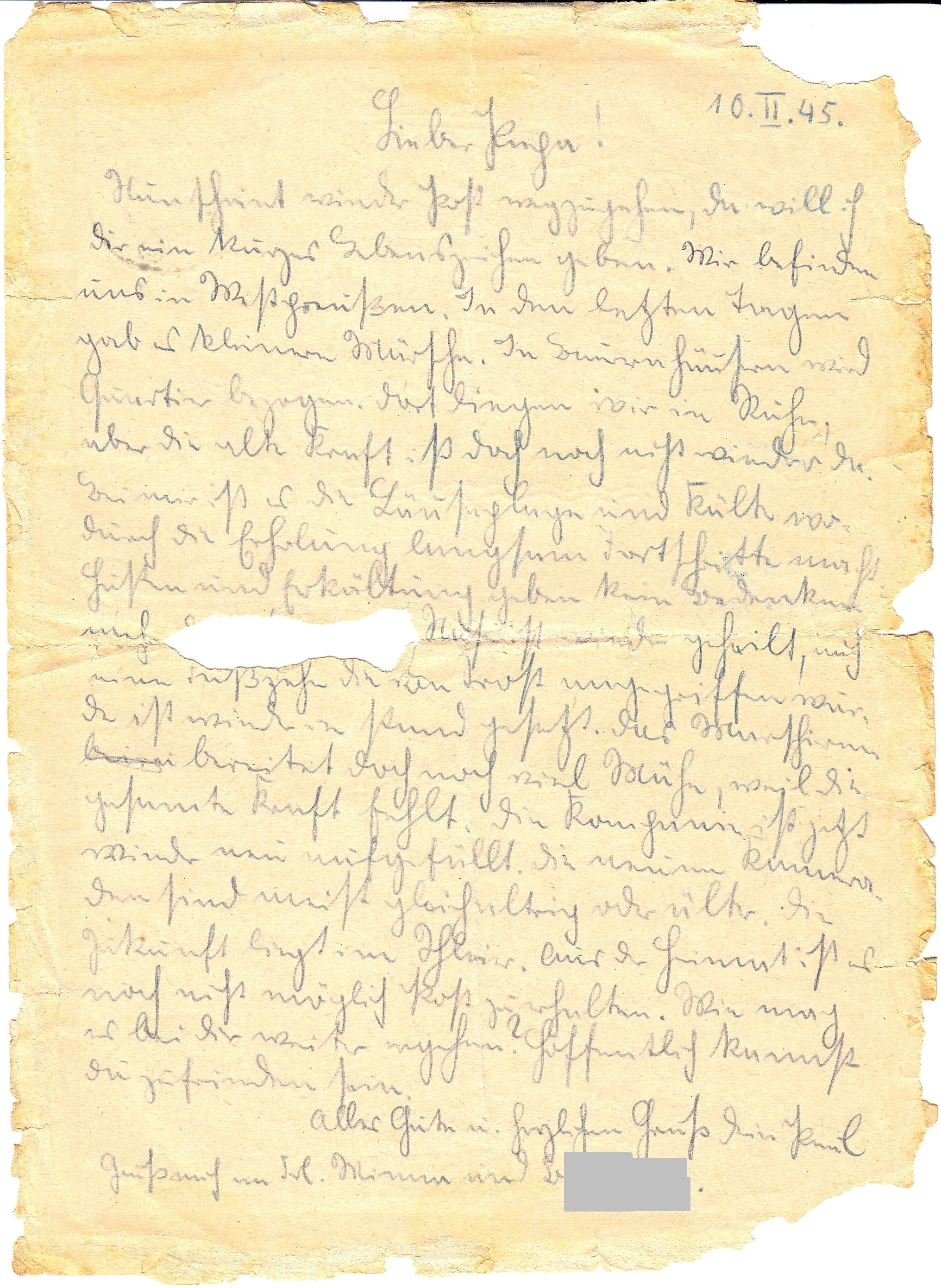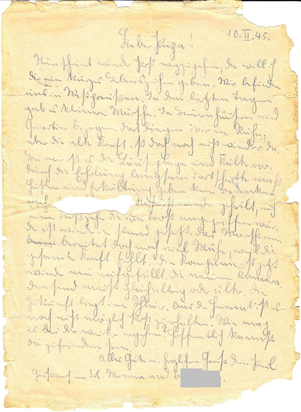 Nun scheint wieder Post wegzugehen, Da will ich Dir ein kurzes Lebenszeichen geben. Wir befinden uns in Westpreußen. In den letzten Tagen gab es kleinere Märsche. In Bauernhäusern wird Quartier bezogen. Dort liegen wir in Ruhe, aber die alte Kraft ist doch noch nicht wieder da. Bei mir ist es die Läuseplage und Kälte wodurch die Erholung langsam Fortschritte macht. Husten und Erkältung geben kein Bedenken mehr. ............. Nase ist wieder geheilt, auch eine Fußzehe die von Frost angegriffen war. Die ist wieder in Stand gesetzt. Das Marschieren bereitet doch noch viel Mühe, weil die gesamte Kraft fehlt. Die Kompanie ist jetzt wieder neu aufgefüllt. Die neuen Kameraden sind meist gleichaltrig oder älter. Die Zukunft liegt im Schleier [?]. Aus der Heimat ist es noch nicht möglich Post zu erhalten. Wie mag es bei Dir weiter ergehen? Hoffentlich kannst Du zufrieden sein.