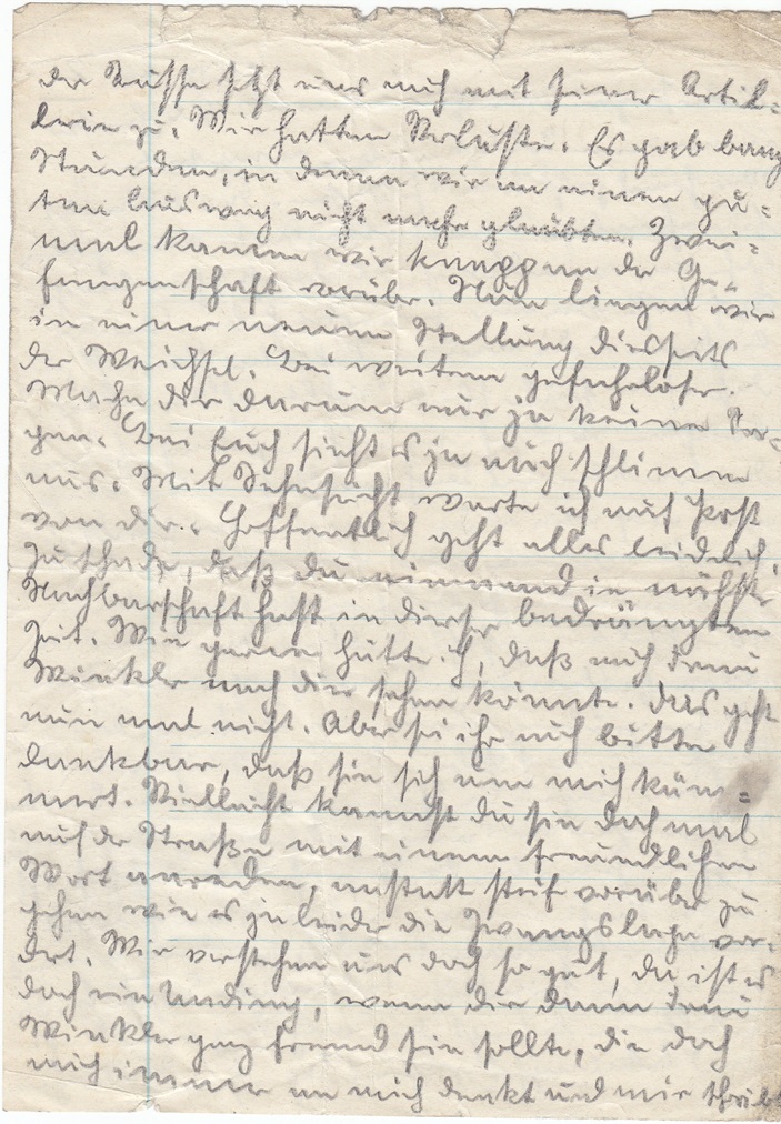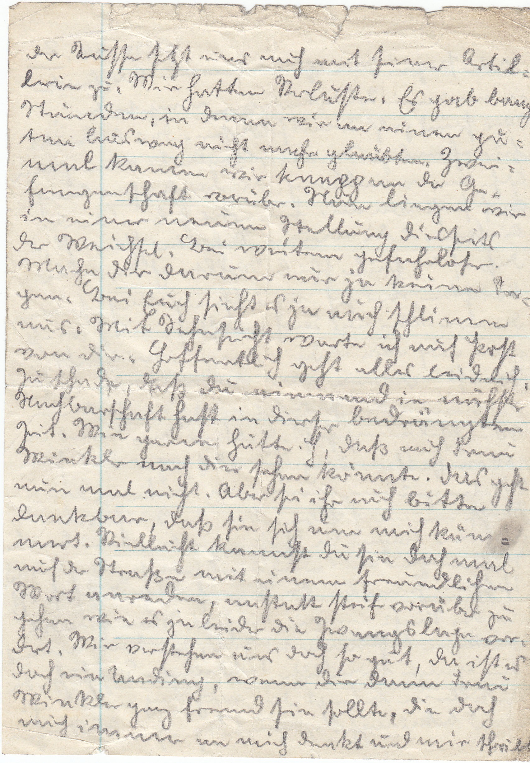 Mache Dir darum nur ja keine Sorgen. Bei Euch sieht es ja auch schlimm aus. Mit Sehnsucht warte ich auf Post von Dir. Hoffentlich geht alles leidlich. Zu schade, daß Du niemand in nächster Nachbarschaft hast in dieser bedrängten Zeit. Wie gerne hätte ich, daß auch Irmi W. nach Dir sehen könnte. Das geht nun mal nicht. Aber sei ihr auch bitte dankbar, daß sie sich um mich kümmert. Vielleicht kannst Du sie doch mal auf der Straße mit einem freundlichen Wort anreden, anstatt steif vorüber zu gehen wie es ja leider die Zwangslage vordert. Wir verstehen uns doch so gut, da ist es doch ein Unding, wenn Dir dann Irmi W. ganz fremd sein sollte, die doch auch immer an mich denkt und mir schreibt.