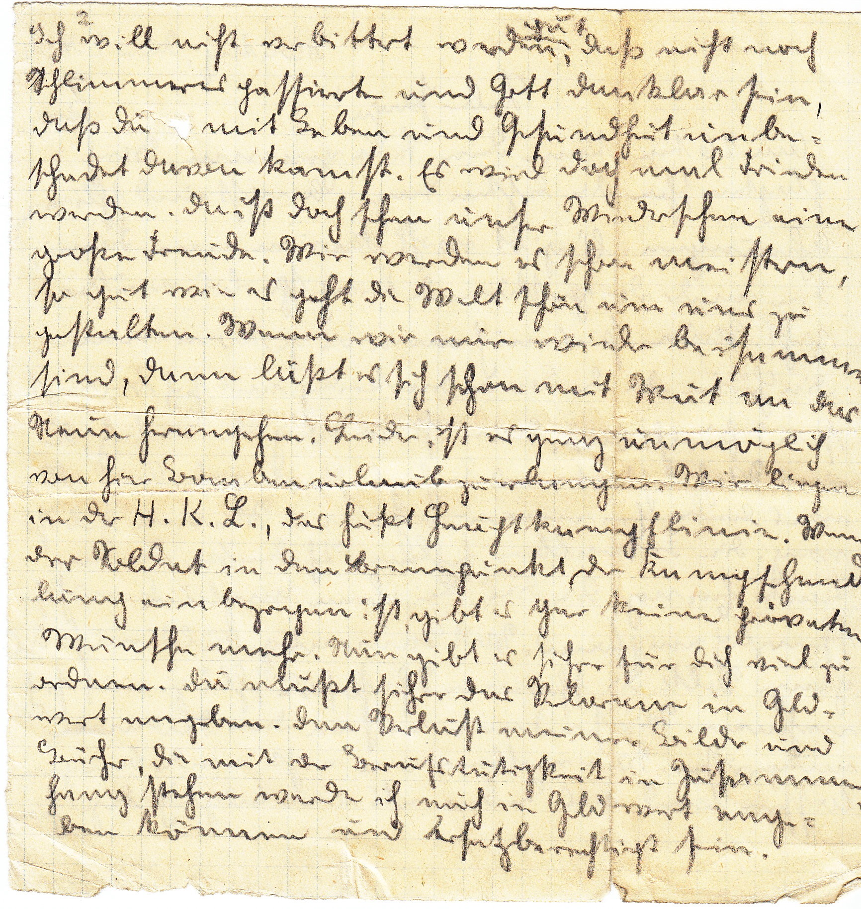 Ich will nicht verbittert werden, gut daß nicht noch Schlimmeres passierte und Gott dankbar sein, daß Du mit Leben und Gesundheit unbeschadet davon kamst. Es wird doch mal Frieden werden. Da ist doch schon unser Wiedersehen eine große Freude. Wir werden es schon meistern, so gut wie es geht die Welt um uns zu gestalten. Wenn wir nur wieder beisammen sind, dann läßt es sich schon mit Mut an das Neue herangehen.