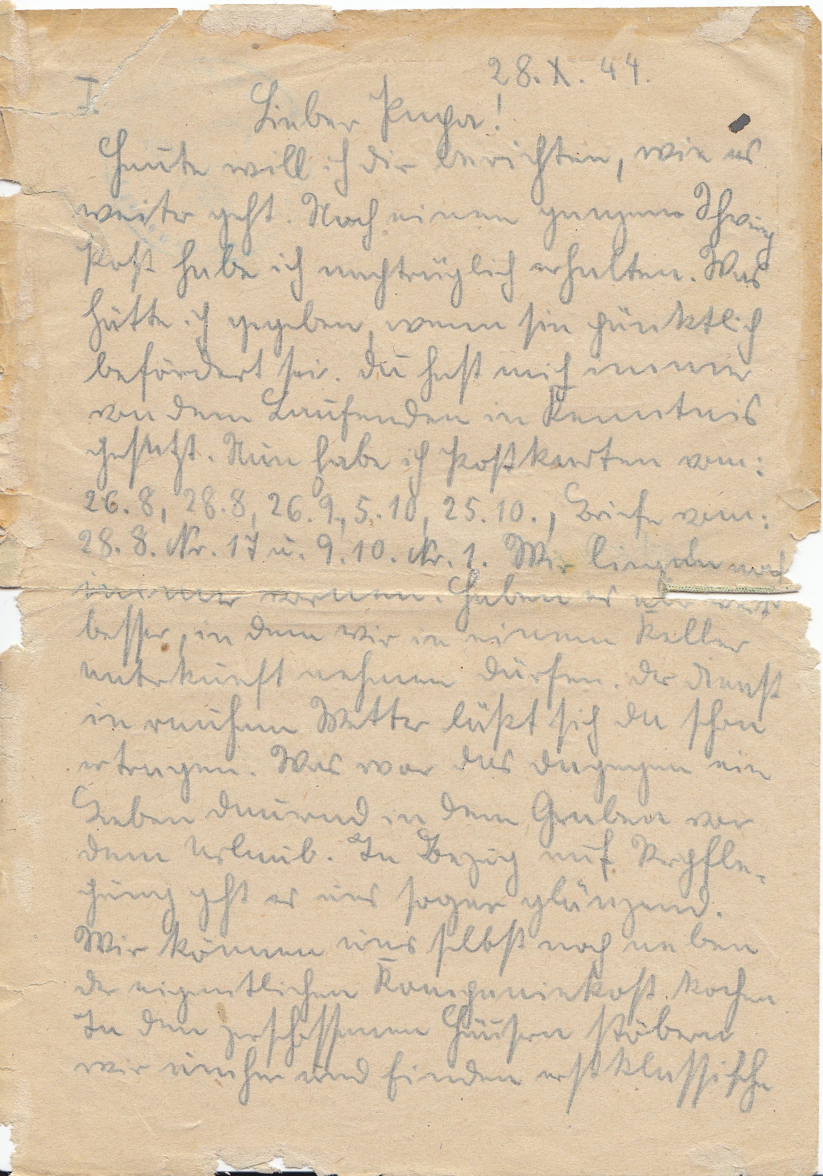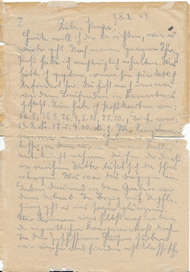 Heute will ich Dir berichten, wie es weiter geht. Noch einen ganzen Schwung Post habe ich nachträglich erhalten. Was hätte ich gegeben, wenn sie pünktlich befördert sei. Du hast mich immer von dem Laufenden in Kenntnis gesetzt. Nun habe ich Postkarten vom: 26.8., 28.8., 26.9., 5.10., 25.10., Briefe vom: 28.8. Nr. 17 u. 9.10. Nr.1.