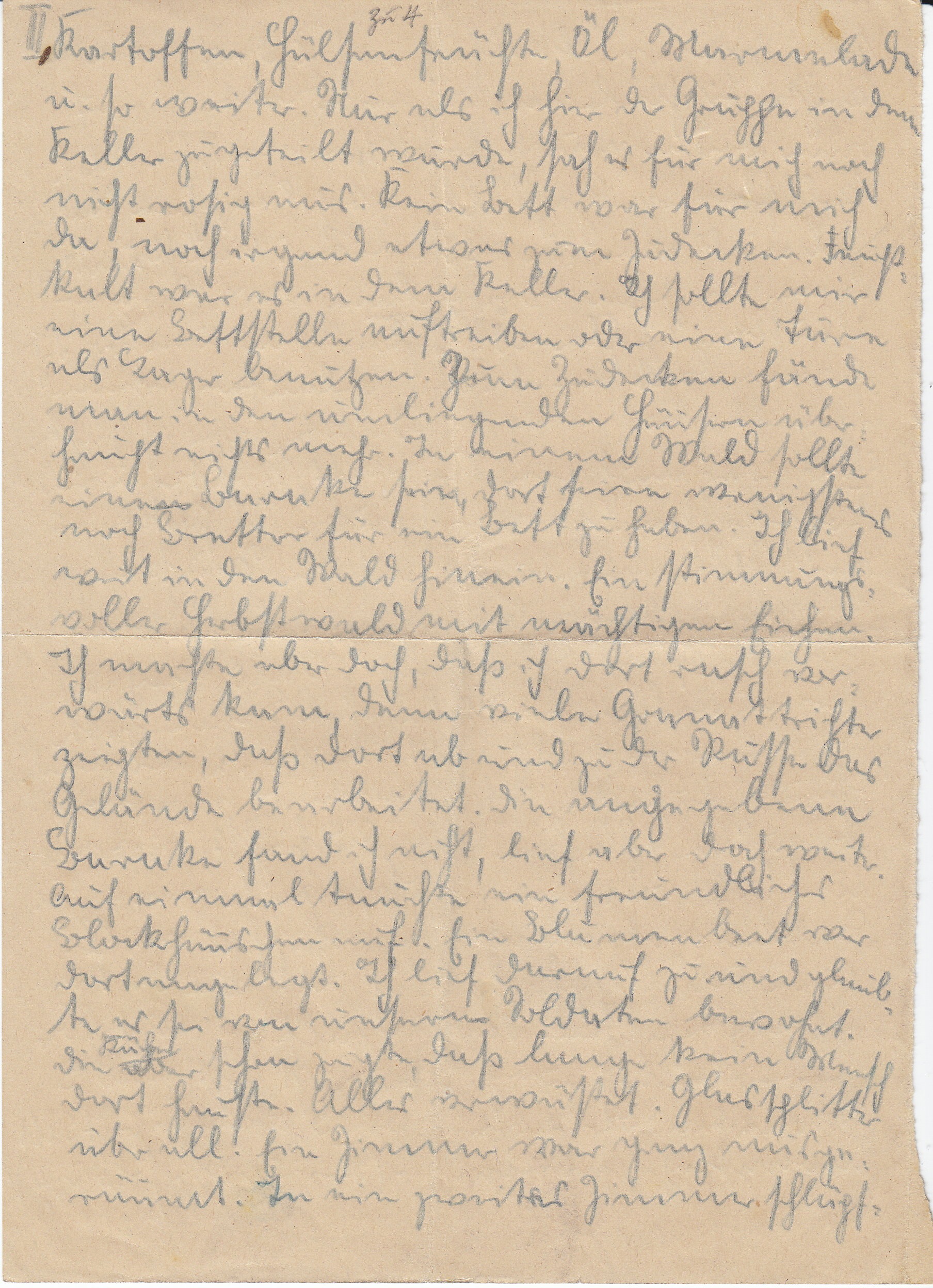 4 ½ Seiten; Bleistift; Handschrift auf einem innen beschriebenen Feldpostkuvert 19,5 cm x 14 cm, abgestempelt am 01.11.44, und zwei eingelegten unlinierten Bögen 21 cm x 15 cm; die Bleistiftnummerierung „4“ ist außen angebracht
