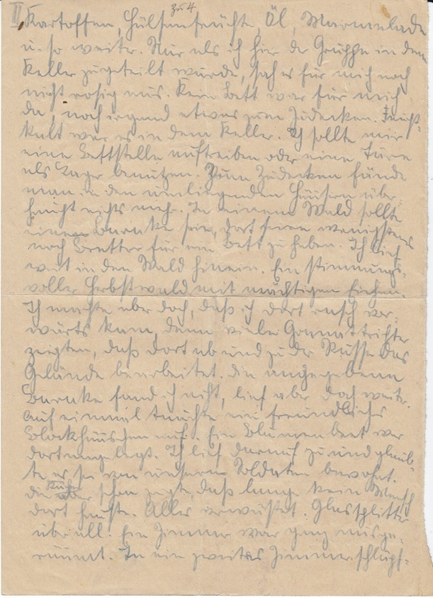 Kartoffeln, Hülsenfrüchte, Öl, Marmelade u. so weiter. Nur als ich hier der Gruppe in dem Keller zugeteilt wurde, sah es für mich noch nicht rosig aus. Kein Bett war für mich da, noch irgend etwas zum Zudecken. Feuchtkalt war es in dem Keller. Ich sollte mir Bettstelle auftreiben oder eine Tür als Lager benutzen. Zum Zudecken fände man in den umliegenden Häusern überhaupt nichts mehr.