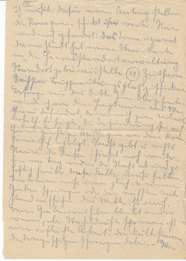 4 ½ Seiten; Bleistift; Handschrift auf einem innen beschriebenen Feldpostkuvert 19,5 cm x 14 cm, abgestempelt am 01.11.44, und zwei eingelegten unlinierten Bögen 21 cm x 15 cm; die Bleistiftnummerierung „4“ ist außen angebracht