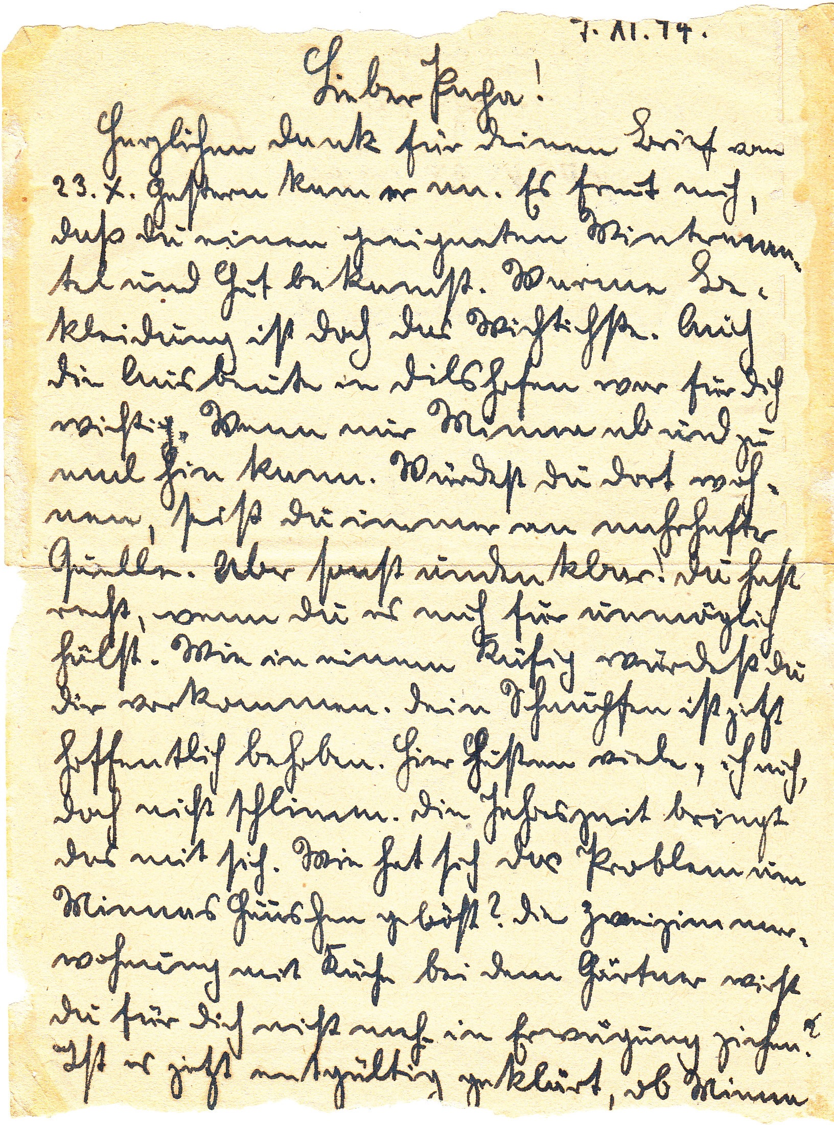 Herzlichen Dank für Deinen Brief zum 23.X. Gestern kam er an. Es freut mich, daß Du einen geeigneten Wintermantel und Hut bekamst. Warme Bekleidung ist doch das Wichtigste. Auch die Ausbeute in Dilshofen war für Dich wichtig. Wenn nur Minna ab und zu mal hin kann. Würdest Du dort wohnen, seist Du immer an nahrhafter Quelle. Aber sonst undenkbar! Du hast recht, wenn Du es auch für unmöglich hälst. Wie in einem Käfig würdest Du Dir vorkommen.