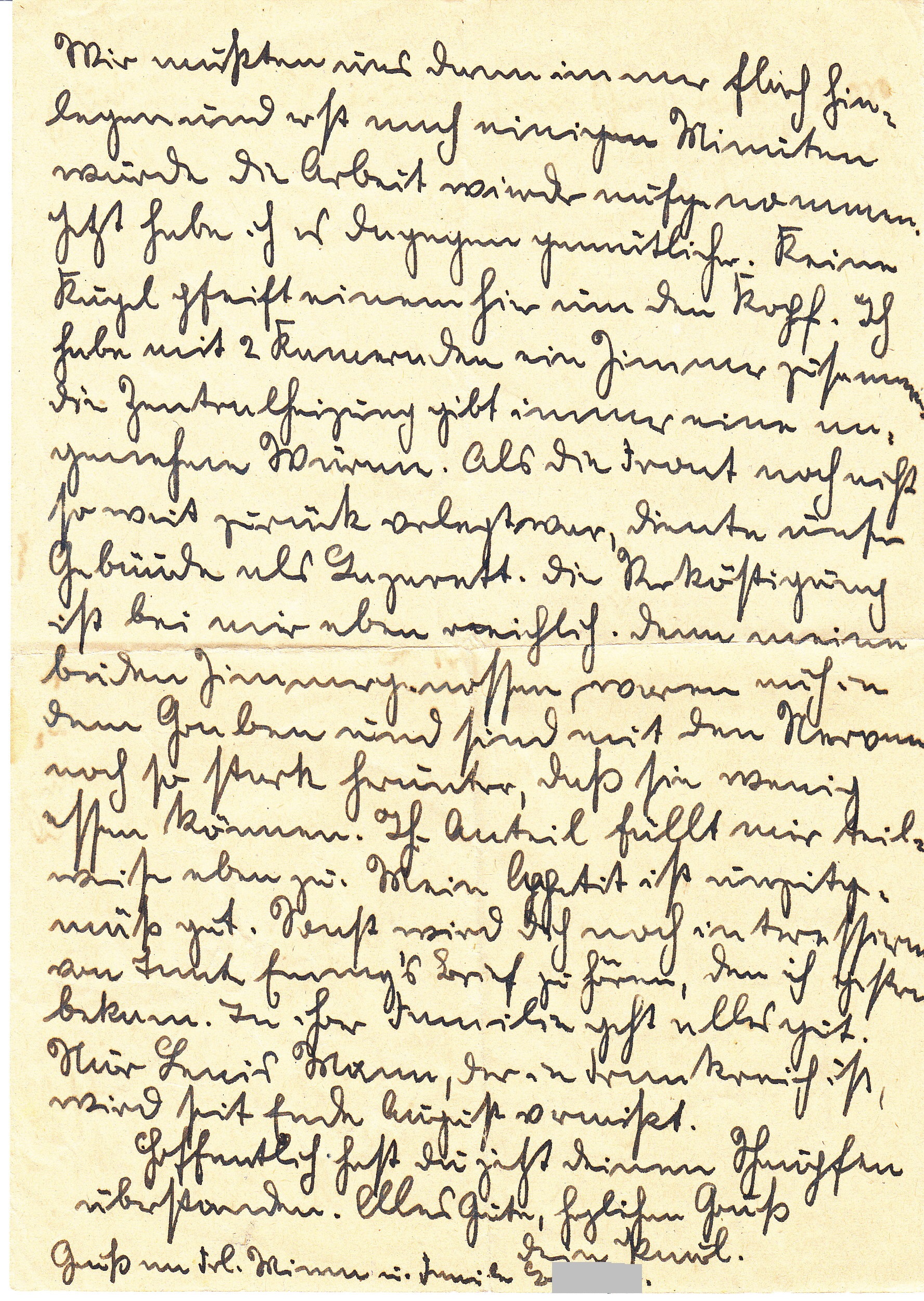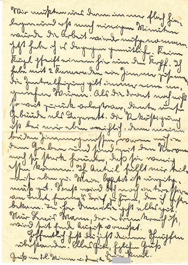 Ich habe mit 2 Kameraden ein Zimmer zusammen. Die Zentralheizung gibt immer eine angenehme Wärme. Als die Front noch nicht so weit zurück verlegt war, diente unser Gebäude als Lazarett. Die Verköstigung ist bei mir eben reichlich. Denn meine beiden Zimmergenossen waren auch in dem Graben und sind mit den Nerven noch so stark herunter, daß sie wenig essen können. Ihr Anteil fällt mir teilweise eben zu. Mein Appetit ist unzeitgemäß gut. Sonst wird Dich noch interessieren von Tante Emmy’s Brief zu hören, den ich gestern bekam. In ihrer Familie geht alles gut. Nur Lenis Mann, der in Frankreich ist, wird seit Ende August vermißt.