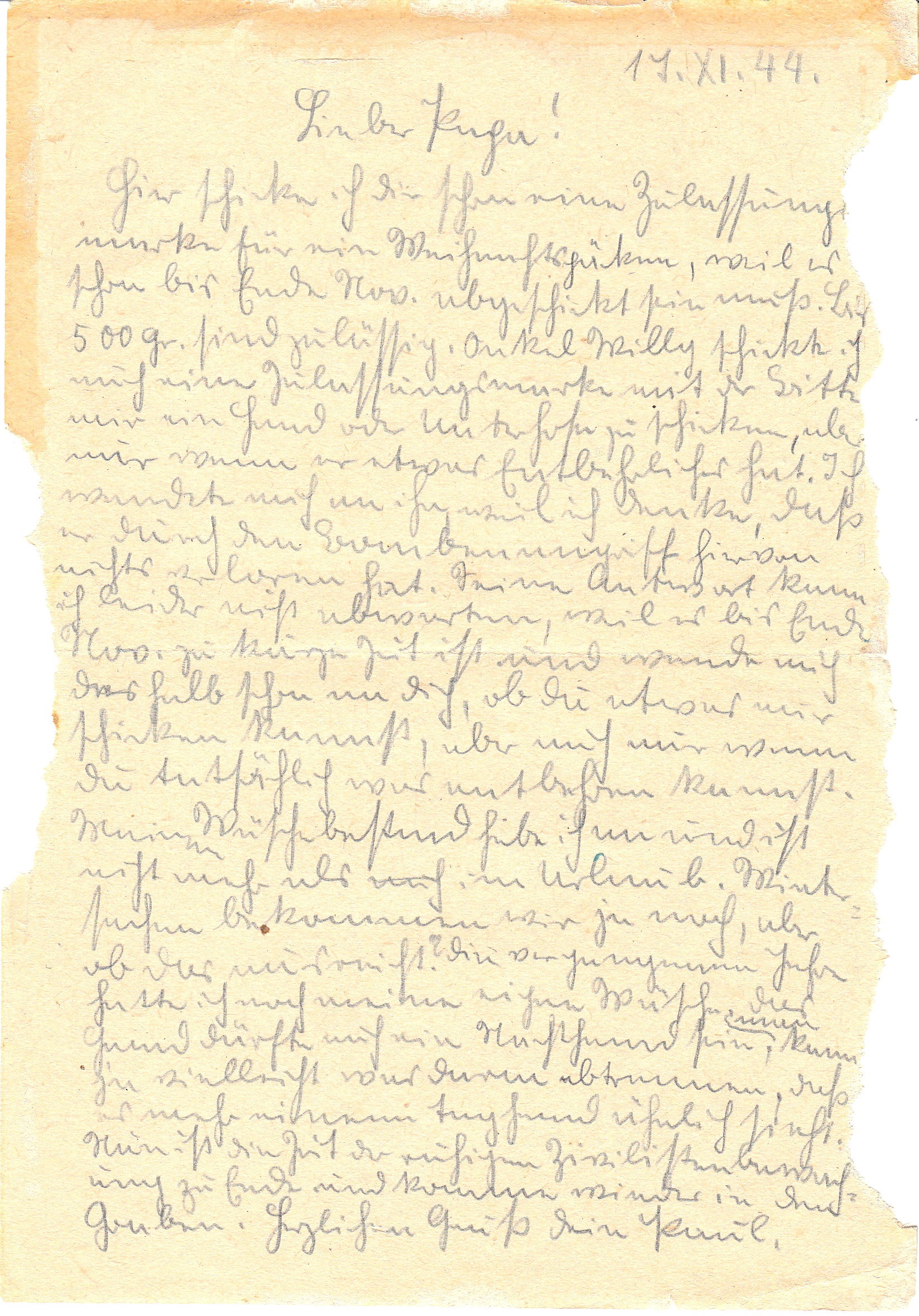 Hier schicke ich Dir schon eine Zulassung[s]marke für ein Weihnachtspäck[ch]en weil es schon bis Ende Nov. abgeschickt sein muß. Bis 500 Gr. sind zulässig. Onkel Willy schickte ich auch eine Zulassungsmarke mit der Bitte mir ein Hemd oder Unterhosen zu schicken, aber nur wenn er etwas Entbehrliches hat. Ich wendete mich an ihn, weil ich denke, daß er durch den Bombenangriff hiervon nichts verloren hat. Seine Antwort kann ich leider nicht abwarten, weil es bis Ende Nov. zu kurze Zeit ist und wende mich deshalb schon an Dich, ob Du etwas mir schicken kannst, aber auch nur wenn Du tatsächlich was entbehren kannst. Meinen Wäschebestand habe ich an und ist nicht mehr als nach im Urlaub. Wintersachen bekommen wir ja noch, aber ob das mir reicht? Die vergangenen Jahre hatte ich noch meine eigne Wäsche, das Hemd dürfte auch ein Nachthemd sein, man kann ja vielleicht was davon [?] abtrennen, daß es mehr einem Taghemd ähnlich sieht.