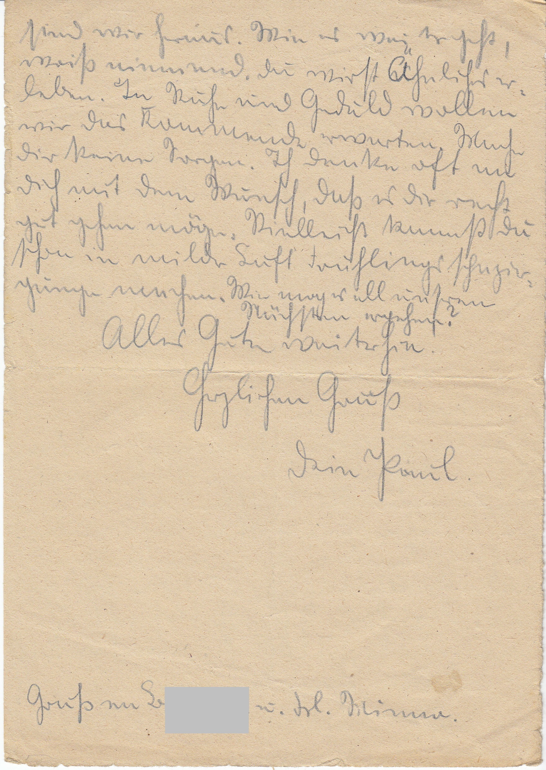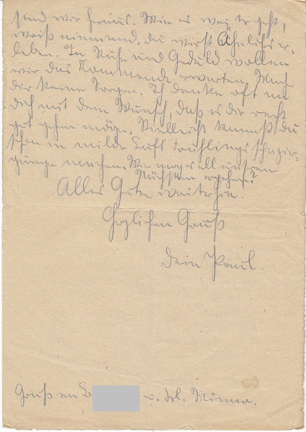 sind wir heraus. Wie es weitergeht, weiß niemand. Du wirst Ähnliches erleben. In Ruhe und Geduld wollen wir das Kommende erwarten. Mache Dir keine Sorgen. Ich denke oft an Dich mit dem Wunsch, daß es Dir recht gut gehen möge. Vielleicht kannst Du schon in milder Luft Frühlingsspaziergänge machen. Wie mag es all unseren Nächsten ergehen?